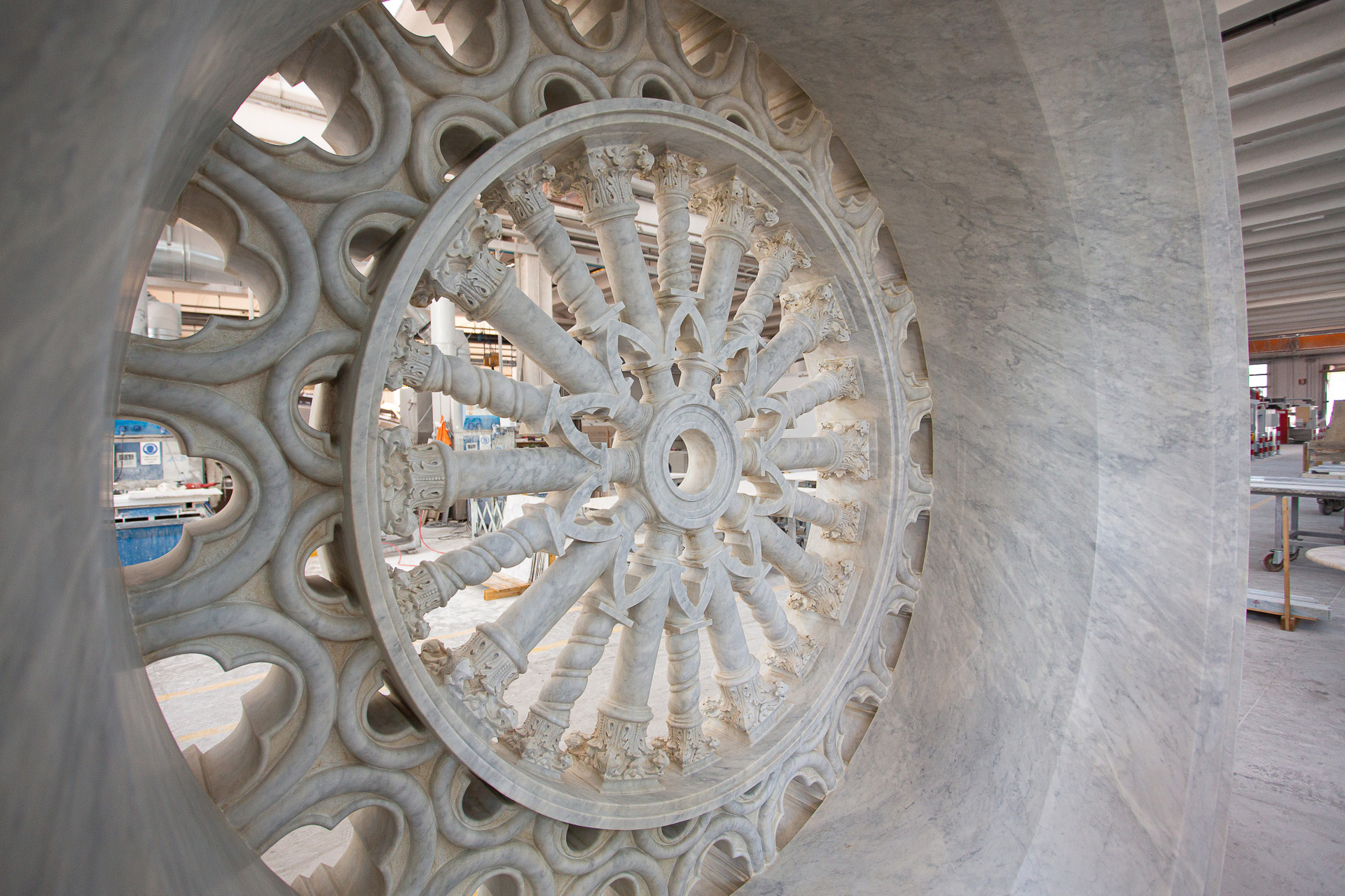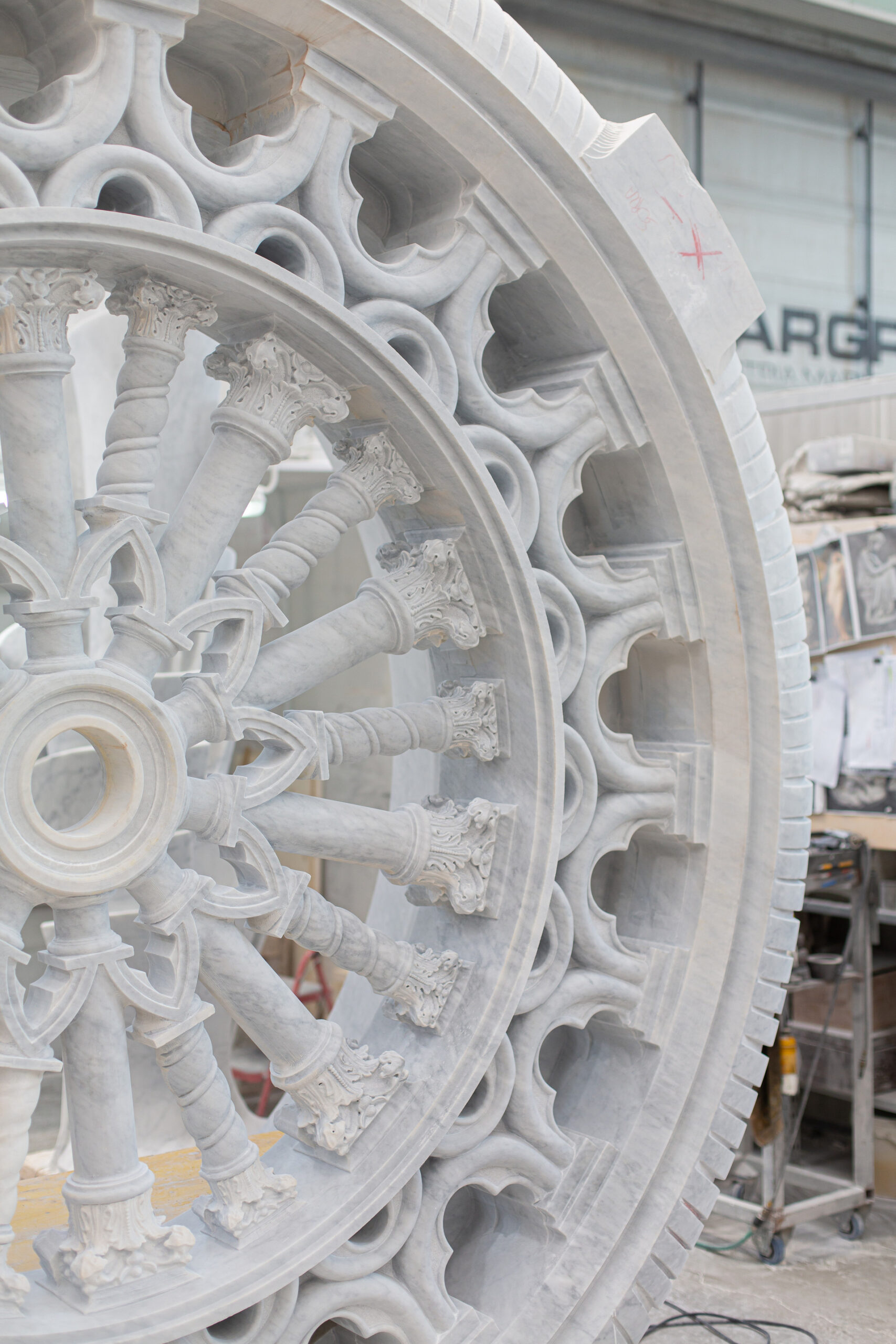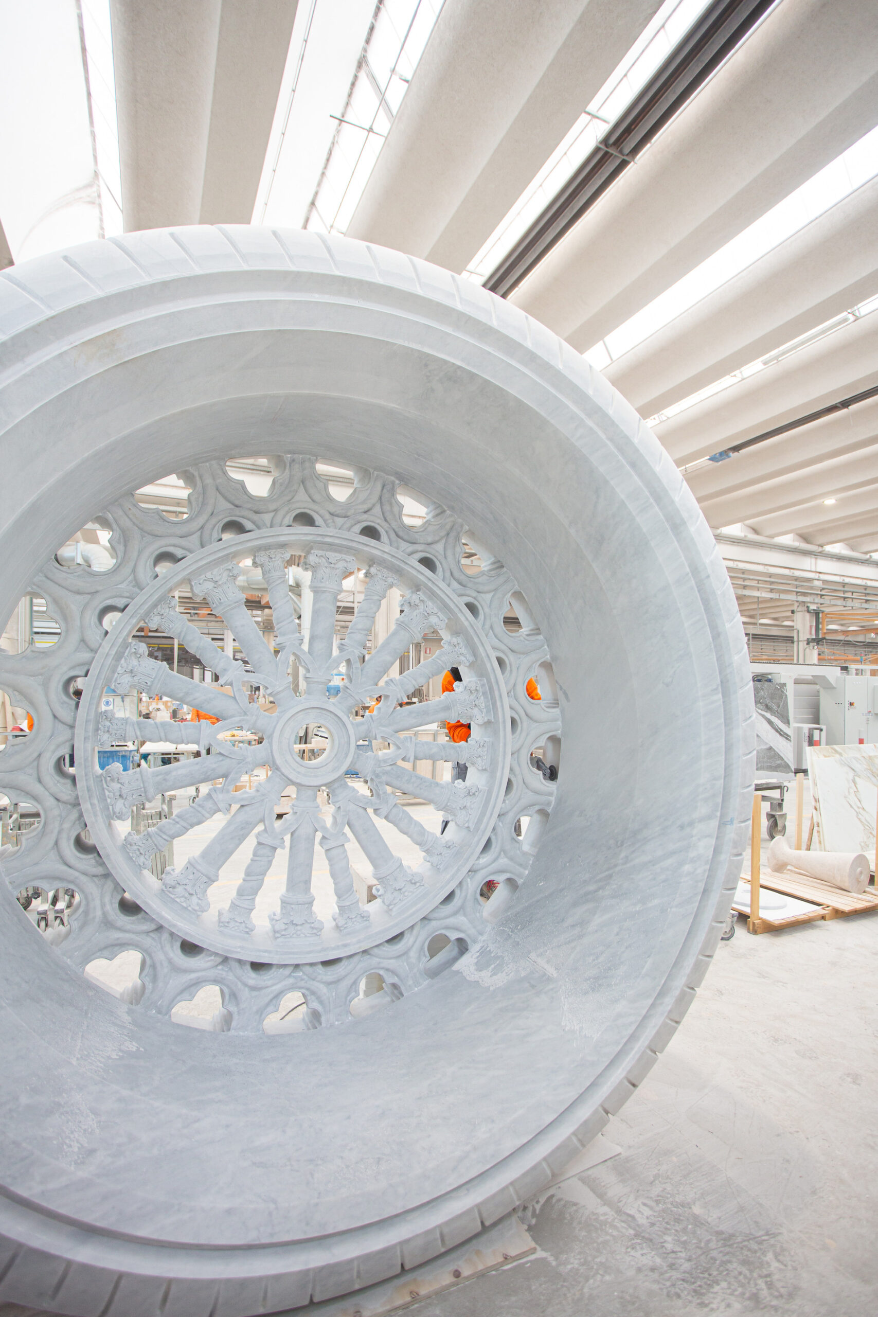 Rotas is a majestic new creation by Fabio Viale, a true magician of materials. Like a modern-day Michelangelo, he “breathes life into marble” transforming it into breathtaking works such as this giant wheel, over 6 feet in diameter, carved from a single block of Margraf Bianco Carrara.