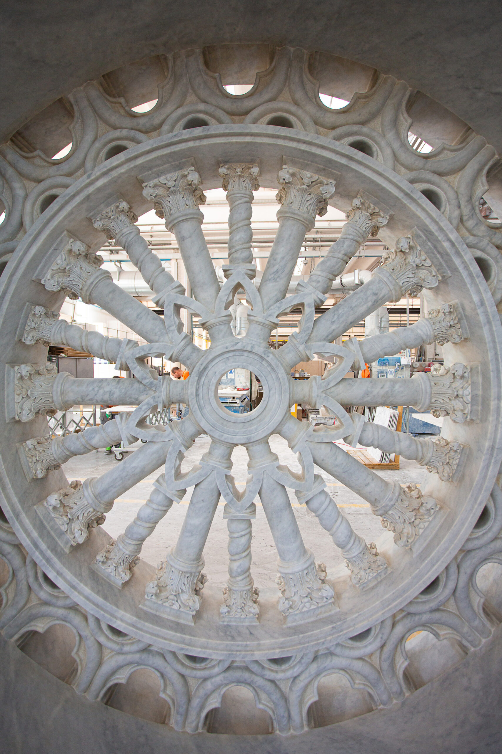 Viale spent over two years shaping this colossal sculpture, first using Margraf’s sate-of-the-art cutting machines, then finishing it entirely by hand. Every step required extreme precision to avoid cracks and unwanted curves. Weighing 6 metric tons, the sculpture is so perfectly round that it can actually roll down the sidewalk.